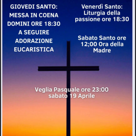Ogni sera: Ore 18:30 – Corona dei Sette Dolori Ore 19:00 – Santa Messa 15 settembre – Festa della Mater Dolorosa Ore 8:30 – Santa Messa Ore 18:30 – Rosario A partire dal 15 settembre, la Messa feriale del mattino tornerà all’orario consueto delle 8:30. Ore 19:00 – Santa Messa solenne