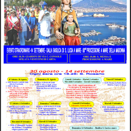 FESTA DI PIEDIGROTTA 2025 “’A Maronna t’accumpagna!” 📅 30 agosto – 14 settembre 2025 📍 Santuario-Parrocchia Santa Maria di Piedigrotta | Napoli La storica Festa di Piedigrotta torna anche quest’anno con un ricco programma di appuntamenti liturgici e popolari, culminando nella straordinaria processione a mare del 14 settembre, dedicata alla Madonna di Piedigrotta, antica protettrice …